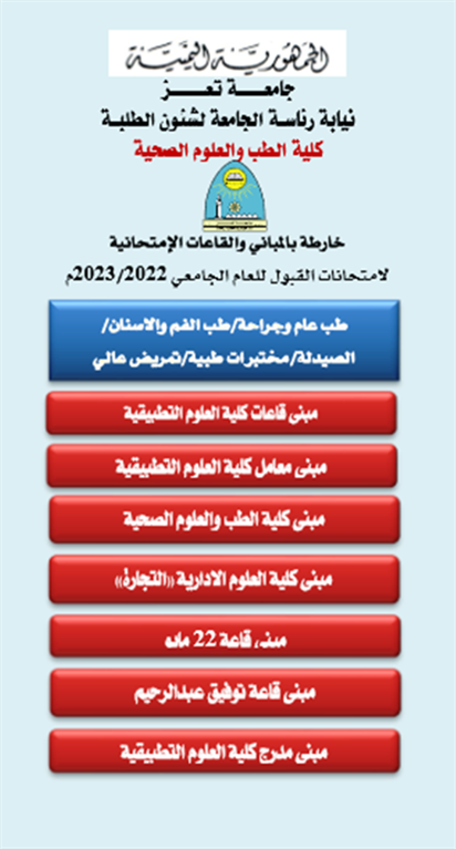 توزيع الطلبة المنسقين بكلية الطب والعلوم الصحية والمتقدمين لامتحانات القبول والمفاضلة على اللجان والقاعات الامتحانية- النظام العام للعام الجامعي 2022/2023م والتي ستجرى يوم الاحد الموافق 05/06/2022م - حبيل سلمان